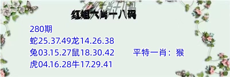 280期正版五字真言:开?00准 【→三一左右←】 解:虎04.鼠18.鸡33.猴34.蛇25 |
